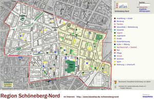 In Zusammenarbeit mit dem Bezirksamt Tempelhof-Schöneberg (Jugendamt) von Berlin hatte der Verband für sozial-kulturelle Arbeit e.V. im Rahmen einer Qualifizierungsreihe zur Sozialraumorien-tierung 2003 eine internetgestützte Datenbank zur sozialen und kulturellen Infrastruktur des Sozial-raums Schöneberg-Nord aufgebaut. Neben einer textbasierten Abfrage konnten die Daten auf einer grafischen Karte auch visuell abgerufen werden.